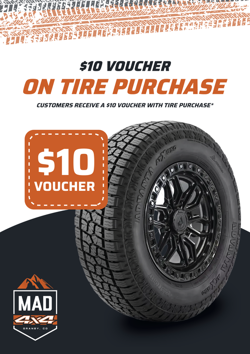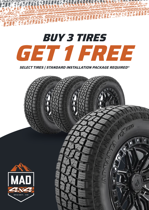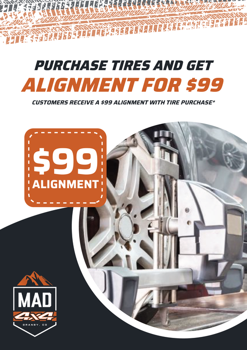 Take advantage of exclusive deals at Mad 4×4 in Granby, CO. Buy three tires and get one free, claim $10 vouchers on tires or oil changes, and get professional alignment for only $99 with tire purchase. Offers available now.